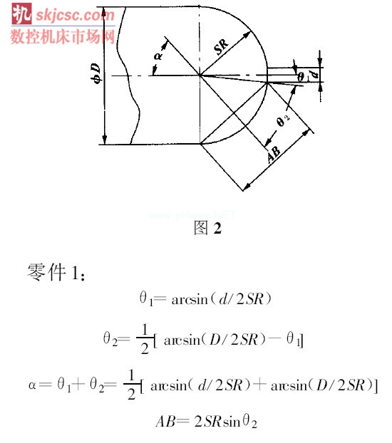 在實際生產(chǎn)中經(jīng)常碰到車削圓球面, 除了單件生產(chǎn)采用雙手控制法加工外, 大都采用旋風(fēng)切削法加工。用旋風(fēng)切削圓球面時, 需要根據(jù)工件球面的形狀計算出刀具盤旋轉(zhuǎn)軸線應(yīng)與工件旋轉(zhuǎn)軸線的夾角α、以及刀具盤上兩刀尖間的距離AB 。